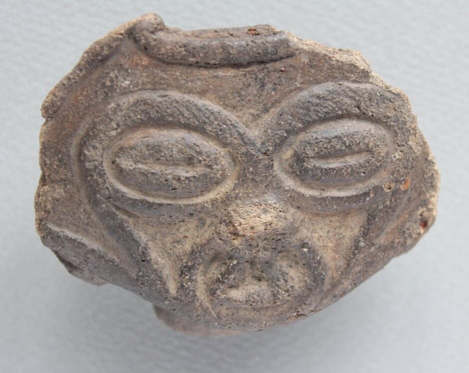 東北日本に広い分布域を持つ遮光器土偶は北海道でも出土します。北海道南部はもちろん、道央部にも広がり、地域の土偶にも形状的な影響を与えました。これは「類亀ヶ岡系」と言う名前でよばれます。道南の亀ヶ岡式土器文化期の遺跡は、函館では女名沢遺跡や大船A遺跡、日の浜遺跡、北斗市では添山遺跡、木古内町の札苅遺跡などが知られています。この土偶頭部が発見された女名沢遺跡からは手足の破片を含めると、多くはありませんが22点、21体の土偶が発見されています。