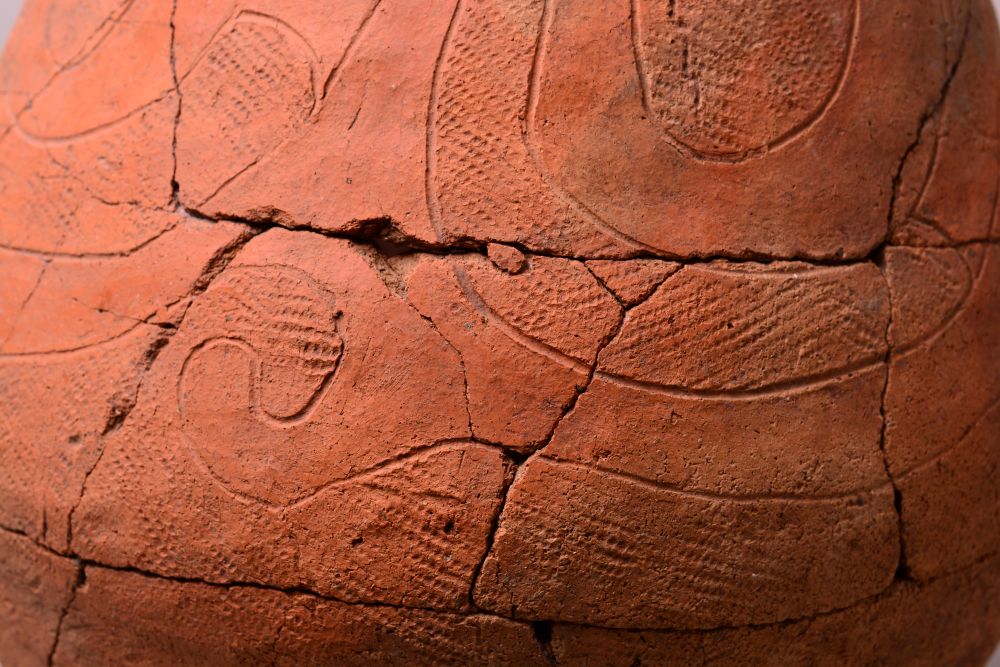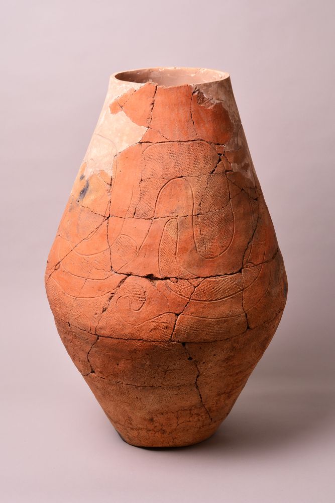 オレンジ色で、とても大きな土器です。形は、口縁が小さく、最大径が胴の下部にある壷形で、小さな底部がつきます。口縁は、装飾のない平坦で単純な作りです。別な土器で蓋をする慣わしだったからでしょうか。器面には隣接する文化圏から伝わった大胆な「波頭」あるいは「J字」形の入組文が描かれます。区画された文様の中には縄文がつけられていました。完成品を持ち込んだのでしょうか、ヒトを呼んで焼かせたのでしょうか。この時期、この大きさで、この姿の土器は海峡の南岸の技術で作られたと考えた方が妥当でしょう。