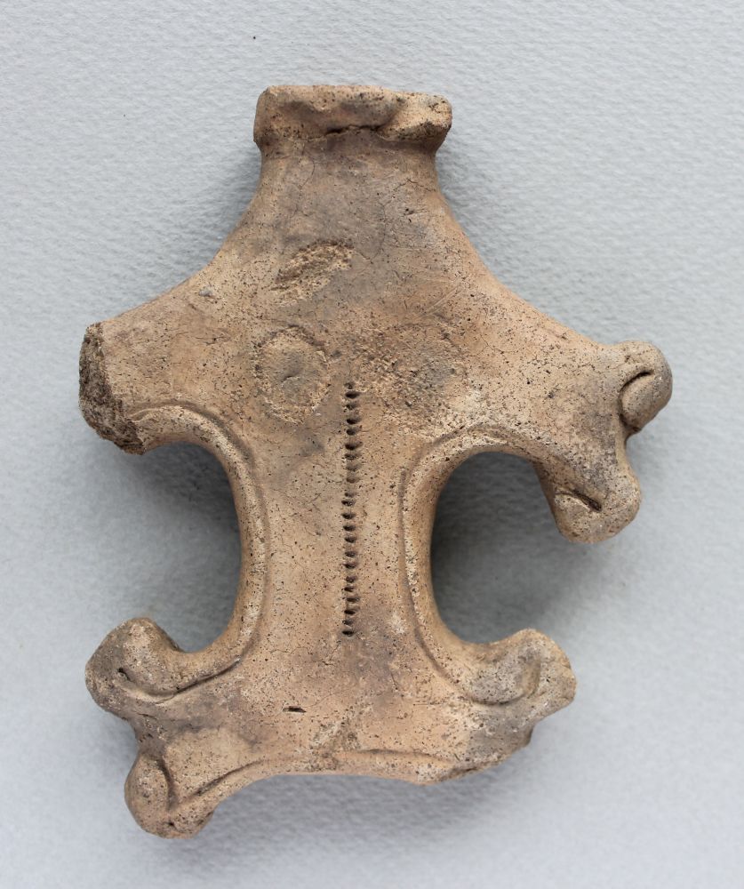 今日ご紹介する土偶は大型で、くびれた胴が握りやすく、赤ちゃんやほかの誰かに向けてクルクルと振り回すには、とても具合が良い形をしています。そうかと思うと土偶の胴部から伸びた四肢の端々にも、晩期の土器の口縁のような飾り文様があり、例えると社寺建築に使われる雲形を立体的にあらわしたようにも見え、霊力を持った仏具の独鈷のようでもあります。欠けて失われている部分もありますが、この四肢には身体の形をなぞるように線が引かれ、土偶全体のフォルムが強調されています。まっすぐ伸びた胴体の上部には猫の肉球のように盛り上がった頭部の形はまるで獲物を狙うイソギンチャクのようです。腹側、背側ともに平たく厚みがあって、腹側の胸には、後付けされた乳房の剥落痕が2箇所みえています。剥落痕の真ん中から下腹部に向かい、連続した突き刺し文様で表現された成長線が現されています。形は変わっていますが、ちゃんと土偶に使われる約束事を守っています。流行・廃りがあるとはいえ、本音を言えば「どうしてこんな形のものを作ったんだろう」とも思いました。抽象と装飾が過ぎて、分類に困ってしまいます。この「C」字あるいは「x」字のモチーフは土器に描かれたり付けられたりする文様にも使われます。鉢形や皿形土器の口縁部にはウサギの耳のように土器から上に突き出して、台付鉢形土器はカブトムシの角のような飛び出しの先端にもつけられます。