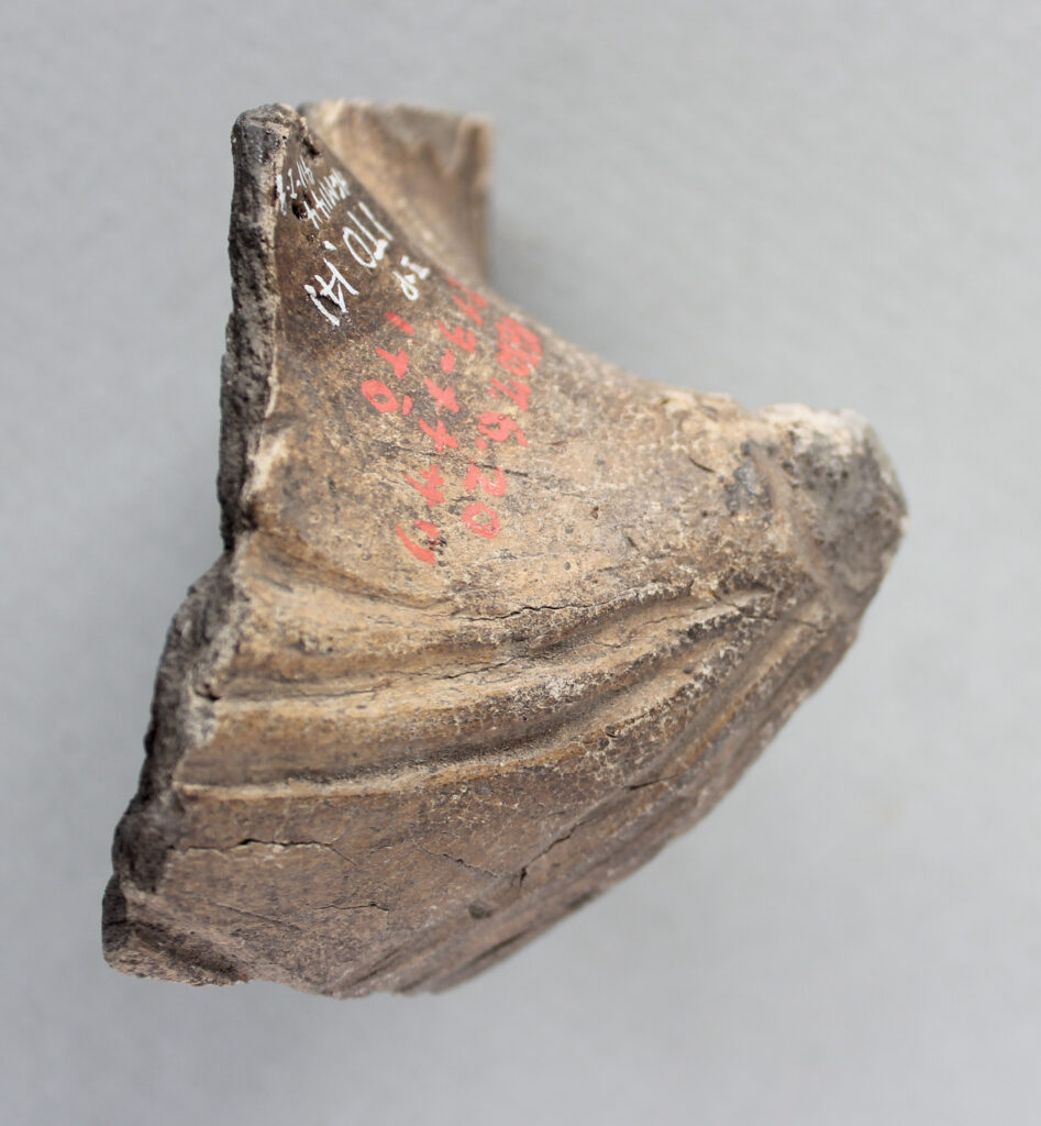 ちなみに、尖底土器とは底がとがった形の土器のことで、今から9000年ほど前の縄文早期に盛んに作られます。津軽海峡の沿岸では、底面が平らな平底土器と尖底土器が前期初頭頃まで交互に現れます。早期の尖底土器の底部先端は乳首のように突き出ていることから、乳頭状突起または乳様突起とも呼ばれたりします。住吉町から発見された尖底土器には、底は乳房形で尖端に乳頭状の突起が見られます。