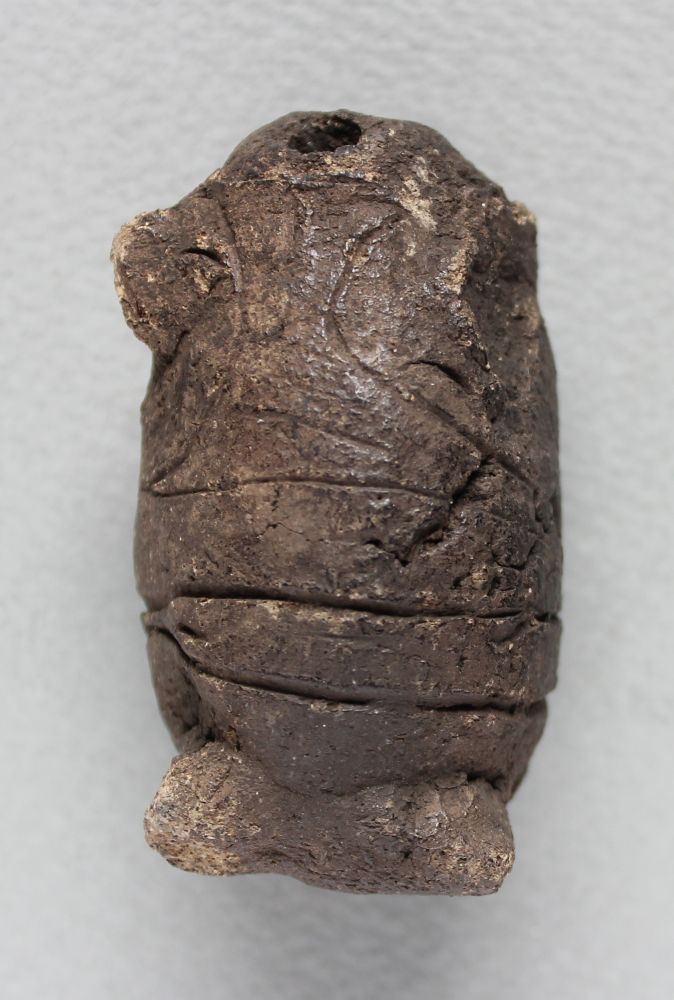 この動物形は、胴の下に前に向かう足が2つ見えています。身体は流線形で、頭と胴体にはクビレがありません。頭部の脇には左右に突出した部分が2箇所、耳でしょうか、目でしょうか。表面には、胴部下に2本の線が横に巡り、頭部にかけて分銅形の充填文様が描かれ、孔に近いここが正面であると教えてくれます。表面が黒く、濡れ色をしているのは、素焼きした後に何かが塗られているからと思われるのですが、薄く均質で良くわかりません。強度と手触りのためでしょう。でも所どころ劣化し、使用感が感じられます。