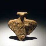 縄文人は土を手に取り土器を作りました。そして自由な発想と想像力が「土偶」を作り出します。さらに彼らは石を打ち欠いたり磨いたりして「岩偶」を生み出します。果たしてモデルは存在したのでしょうか。14,500年前(草創期)愛媛県の上黒岩岩陰遺跡では円礫に刻線で描かれた岩偶が発見され、最古のものとされています。石を材料にしたヒトガタは、石という表現がしにくい素材の特長によって、独特の表現がされることになります。岩偶の形を一言であらわすなら「奇怪(きっかい)」でしょう。作りにくいからこそわかりやすく、石の(でく)としてのカタチがはっきりしてきます。岩偶の長所は素材の硬さから来る「シンプル」な形と石の持つ「不変性」という特性なのだと考えられます。