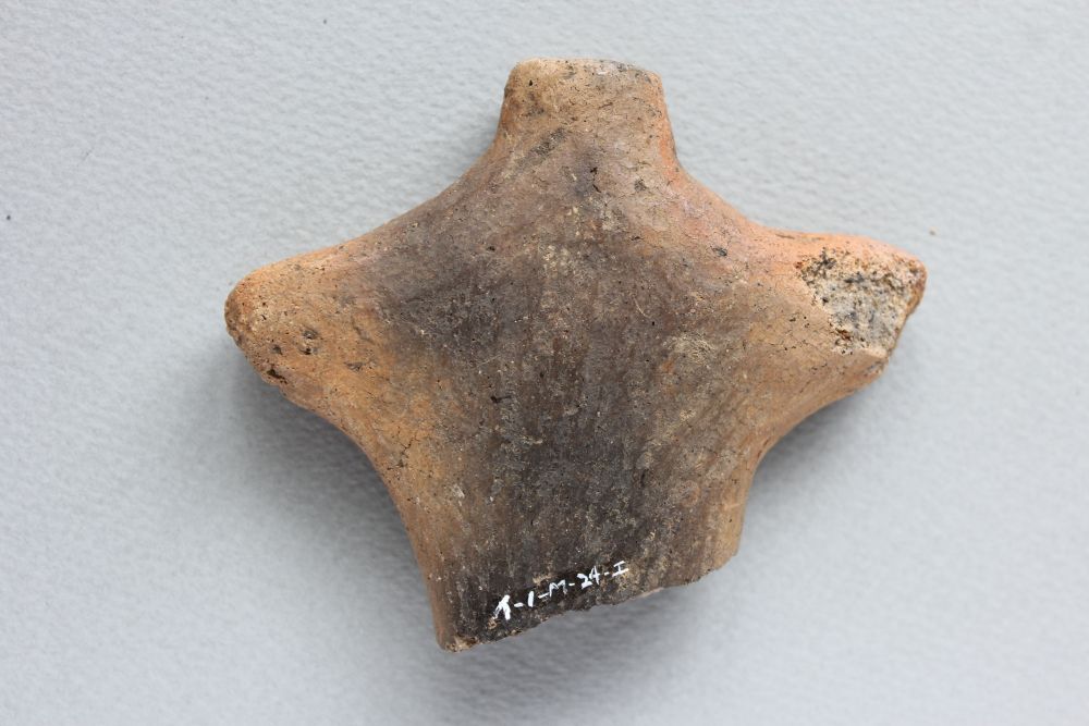 北海道は土偶の少ない地域です。函館周辺は北海道の中ではやや土偶の多い土地ではありますが、それでも系統立てて説明が付くほど十分な量は発見されていないのが現状です。おそらく、この土偶は少し離れた場所から旅して来たようです。この土偶は円筒土器文化圏の南に接する大木式土器文化圏の中期から中期後半の土偶に見られる特徴を持っています。