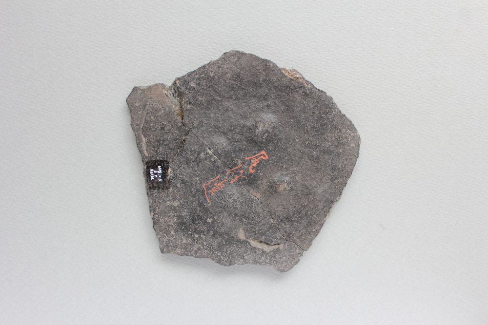 本日ご紹介するのは底の部分です。「どこ?何のソコ?」と聞かれると答えがたいのです。平面は円形なので土器の底だったかと思うのですが、「土器にはならなかった」のかな、と考えた訳です。この資料は今から115年前の明治41年(1908)に谷地頭で発見されました。残されたカケラの端が、わずかに上に向かって緩やかに立ち上がっています。それなので、元は「土器の底」かと推測しました。平らな部分は厚さ1.7㍉と薄く、低い温度ですが焼かれてもいます。これほど薄く焼かれる器は、縄文時代晩期の土器や製品の特徴と考えられます。加えて、平らな部分が広いことから、皿形か蓋とも推測しました。