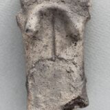 板状の土偶は、海峡の北岸では早期から晩期まで続く、この地域の伝統的な土偶の作り方です。若干厚みがあるのは首から上と胴部の縁と手の部分。背中は平らです。これは、台のようなものの上に置いて作ったということでしょう。土偶の文様は背腹両面にありますが、頭部に厚みがあり、胸に2個の突起のあるほうが腹(正面)と考えられます。